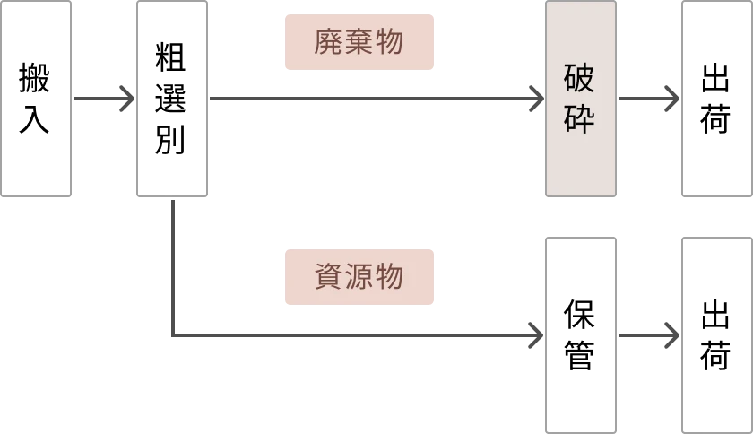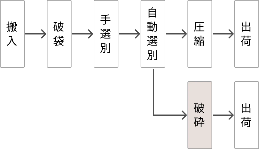 中島リサイクルセンターでは、粗選別後、破砕の工程を経て、二次処理先に出荷されます。