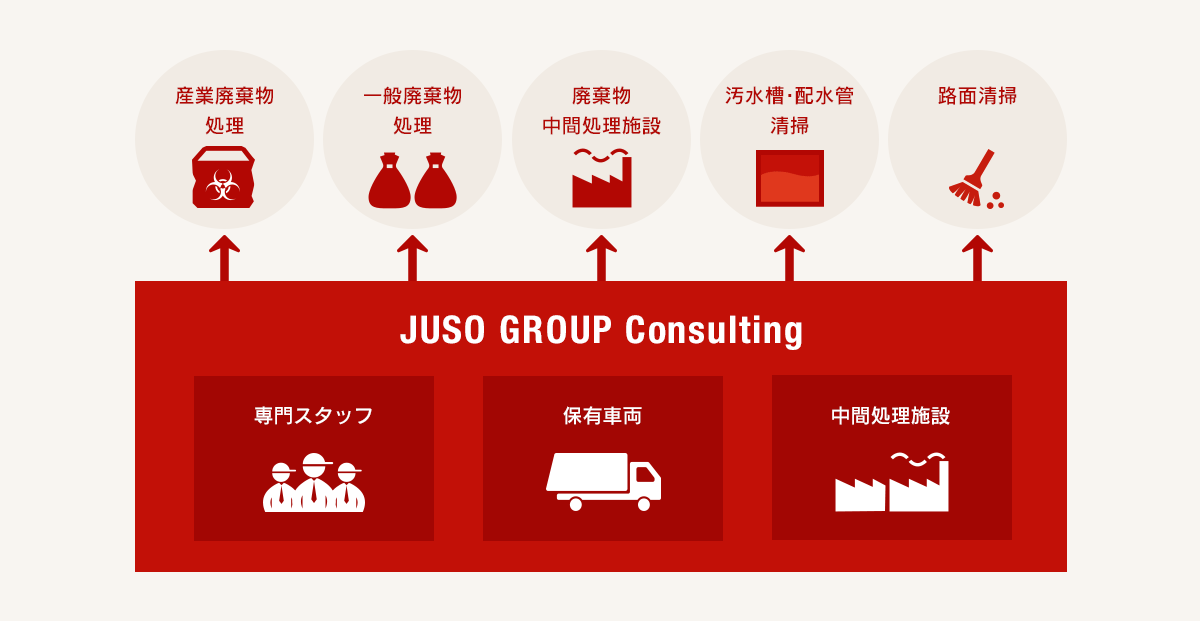 JUSO GROUP ではお客様に適正な処理を行っていただくべく、廃棄物処理・清掃についてのコンサルティングをさせていただくとともに、