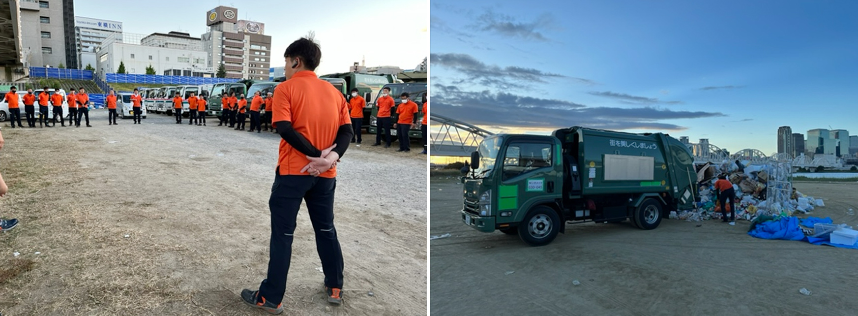翌朝の5:00~清掃作業が開始されます。スタッフの点呼と持ち場の確認を行って、作業開始です。