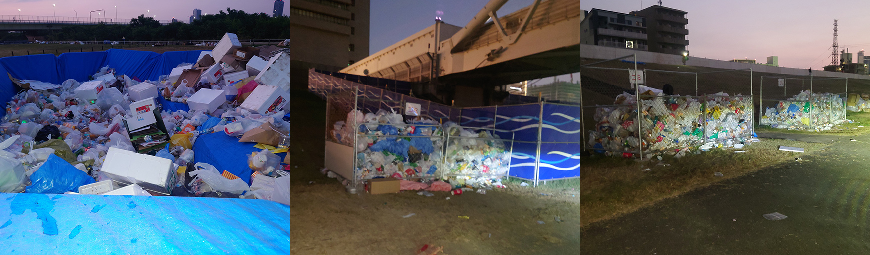 翌朝の4:00、作業前の河川敷や周辺はゴミで溢れかえります…